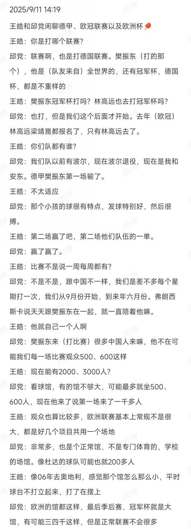 樊振东在德甲联赛的起步并非一帆风顺,在上周进行的第一轮联赛中,樊振东的德甲首秀并不顺利,他出战两场,均遗憾落败;王皓虽然远在国内,却时刻关注着弟子的表现,透过与邱党的交流,他不仅了解到樊振东的首秀战绩,还特意为弟子的失利发声解释,认为这是“不太适应”的结果,这番对话展现了王皓作为主管教练对樊振东的了解和维护,除此以外,王皓还向邱党询问林高远是否也会去打德国冠军杯
